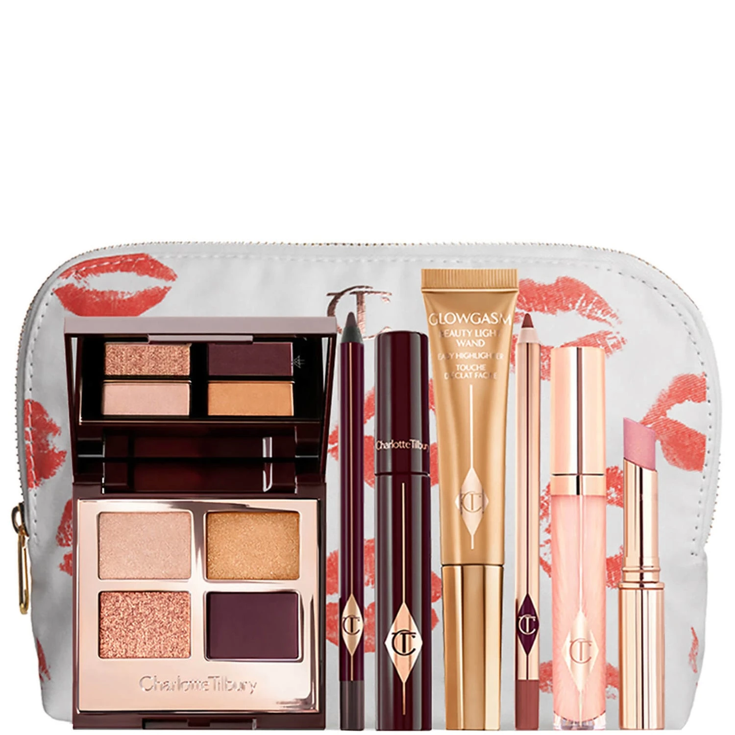 Available in two tone-flattering variations and housed in a pretty kiss-print pouch, this ultra-exquisite kit is here to help you achieve ‘The Queen of Glow’ look. The ‘Deep’ contains the luxury eyeshadow quad in ‘Queen of Glow’, together with Rock N Kohl liner in ‘Barbarella Brown’ and the award-winning Full Fat Lashes mascara in ‘Glossy Black’. To lend your cheeks a touch of luminosity, theres the Beauty Light Wand in ‘Goldgasm’ and behind an immaculate pout is her holy trinity of lip treats: the Lip Cheat liner in suede brown ‘Foxy Brown’, Pillow Talk Diamonds in ‘Lucky Diamonds’ and the plumping Collagen Lip Bath in ‘Refresh Rose. In the ‘Light’, you’ll find the Queen of Glow palette; the Rock N Kohl liner in ‘Barbarella Brown’; Full Fat Lashes mascara in ‘Glossy Black’; the Beauty Light Wand in ‘Goldgasm’; the Lip Cheat liner in neutral nude ‘Hot Gossip’, Pillow Talk Diamonds in ‘Lucky Diamonds’ and the Collagen Lip Bath in ‘Refresh Rose.